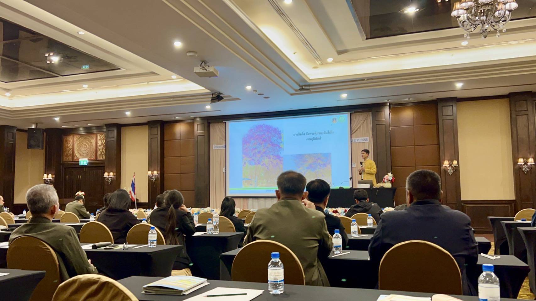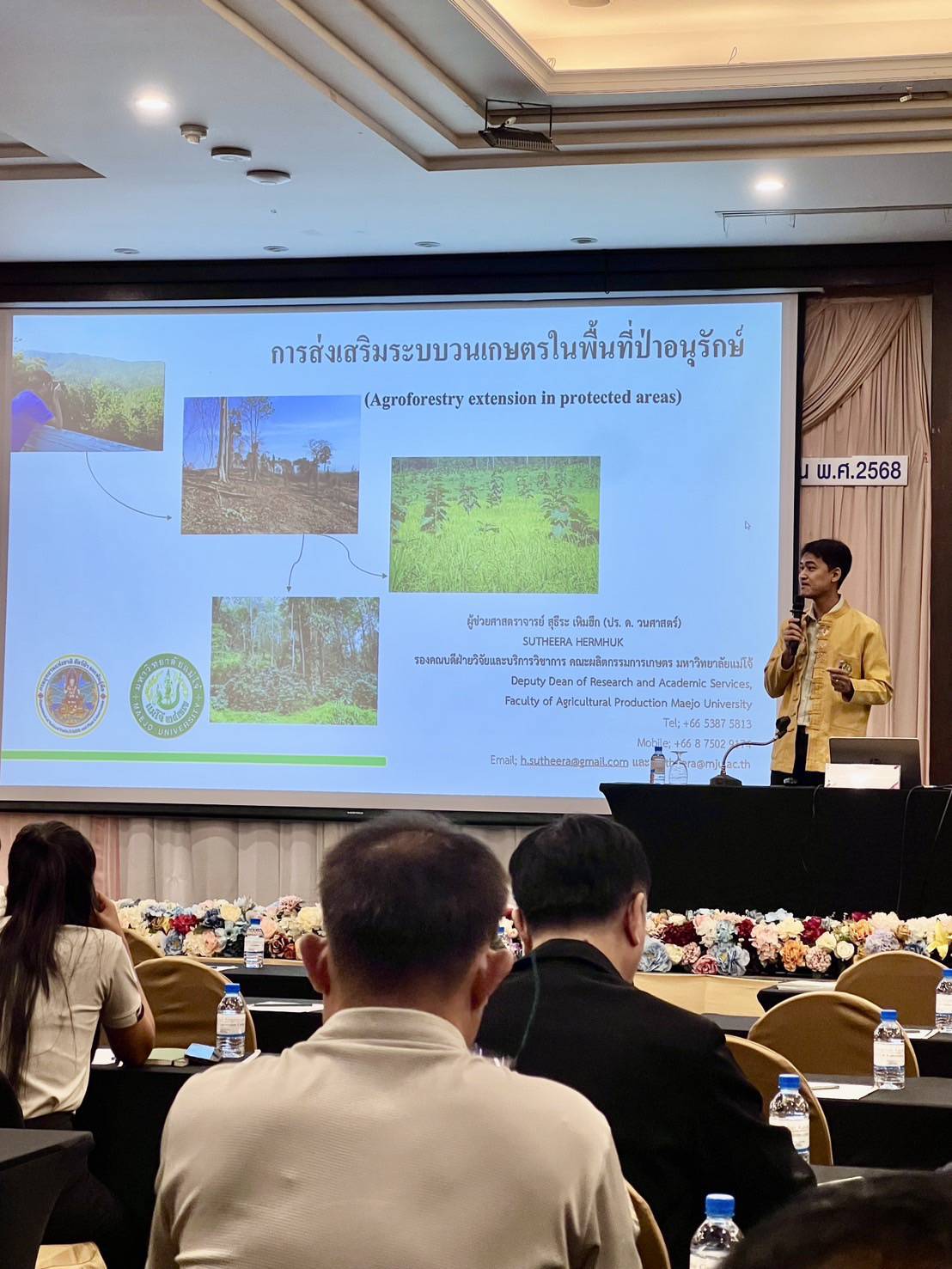 วันที่ 7 พฤษภาคม 2568 ณ ห้องประชุมโรงแรมเชียงใหม่ แกรนด์วิว จังหวัดเชียงใหม่ ผู้ช่วยศาสตราจารย์ ดร.สุธีระ เหิมฮึก รองคณบดีฝ่ายวิจัยและบริการวิชาการ เป็นวิทยากรบรรยายให้กับสำนักอนุรักษ์และจัดการต้นน้ำ กรมอุทยานแห่งชาติ สัตว์ป่า และพันธุ์พืช ในหัวข้อเรื่อง การส่งเสริมระบบวนเกษตร ในพื้นที่อนุรักษ์ โดยมีหัวหน้าหน่วยงานสนามด้านการสร้างการอนุรักษ์และจัดการต้นน้ำในสังกัดจำนวน 60 ท่าน เป็นผู้รับฟังบรรยาย
