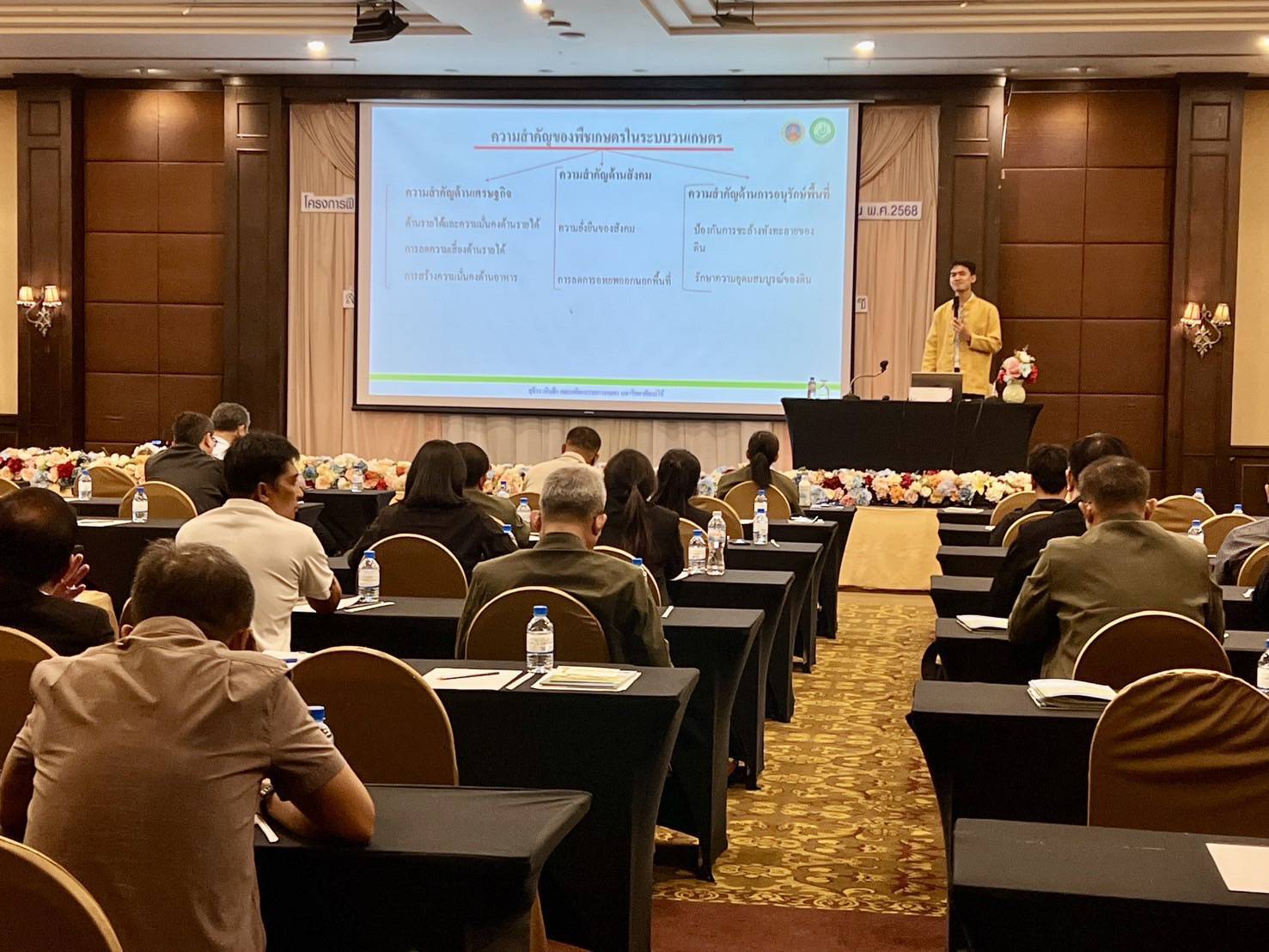 วันที่ 7 พฤษภาคม 2568 ณ ห้องประชุมโรงแรมเชียงใหม่ แกรนด์วิว จังหวัดเชียงใหม่ ผู้ช่วยศาสตราจารย์ ดร.สุธีระ เหิมฮึก รองคณบดีฝ่ายวิจัยและบริการวิชาการ เป็นวิทยากรบรรยายให้กับสำนักอนุรักษ์และจัดการต้นน้ำ กรมอุทยานแห่งชาติ สัตว์ป่า และพันธุ์พืช ในหัวข้อเรื่อง การส่งเสริมระบบวนเกษตร ในพื้นที่อนุรักษ์ โดยมีหัวหน้าหน่วยงานสนามด้านการสร้างการอนุรักษ์และจัดการต้นน้ำในสังกัดจำนวน 60 ท่าน เป็นผู้รับฟังบรรยาย